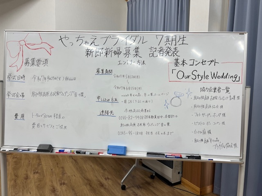 商業科3年生の課題研究授業では、「やっちゃえブライダル」として結婚式をプロデュースすることを通じて地域の魅力や課題、地域の人たちのと連携、多様性の尊重などを学んでいます。これまでにも多くのカップルとそのご家族様のご理解とご協力をいただき、結婚式をプロデュースしてきましたが、あらたにご協力いただけるカップルを募集するための記者発表を行いました。